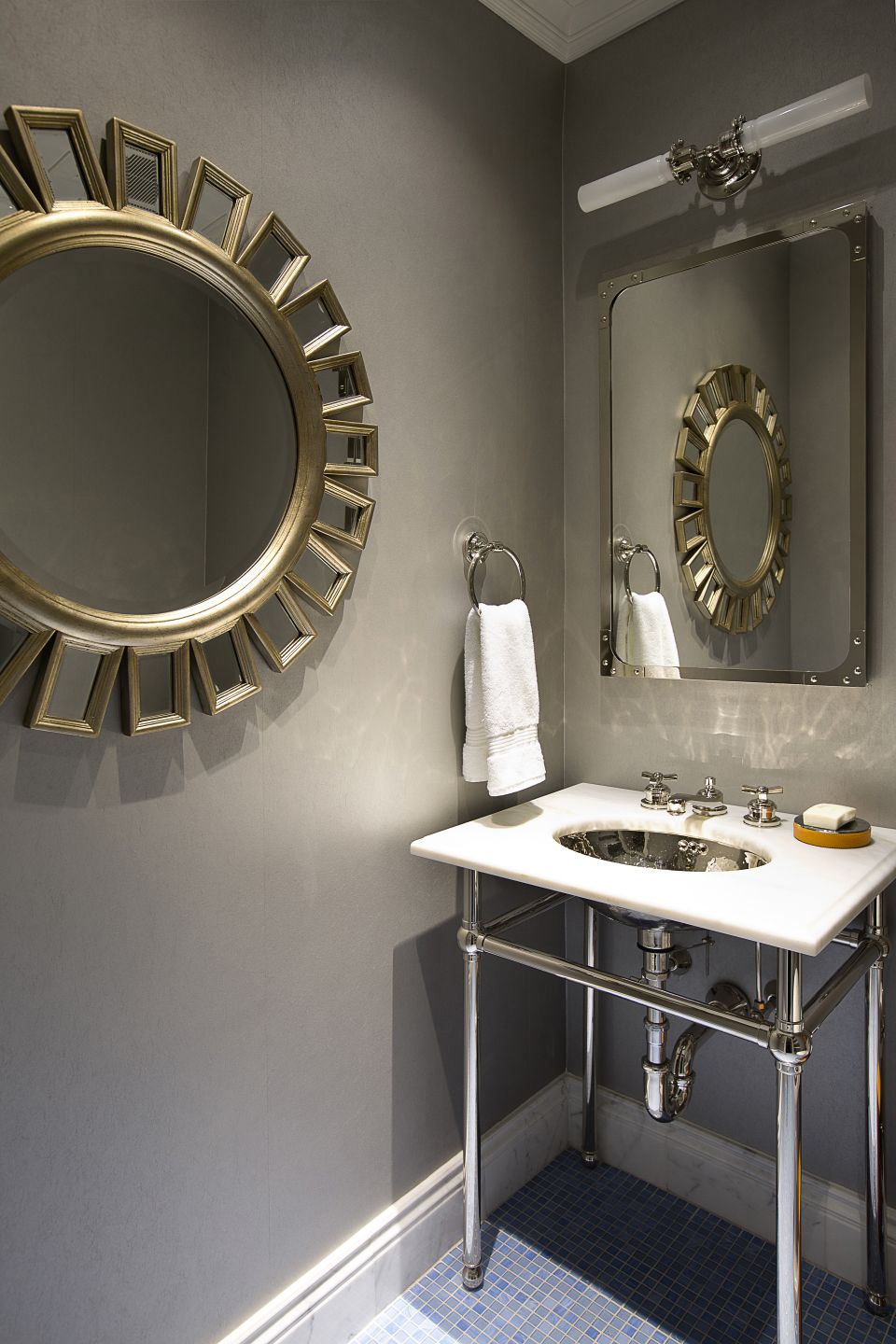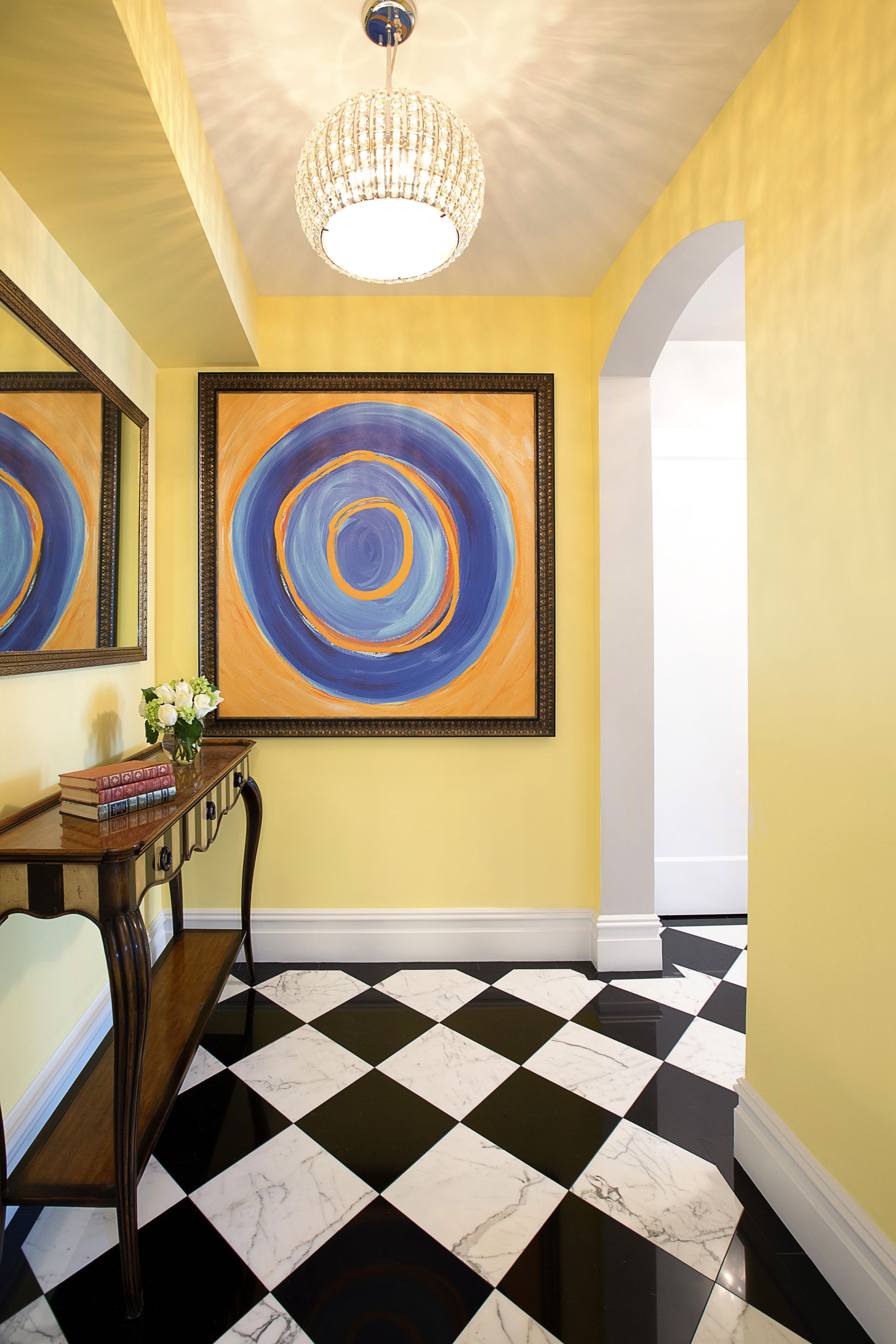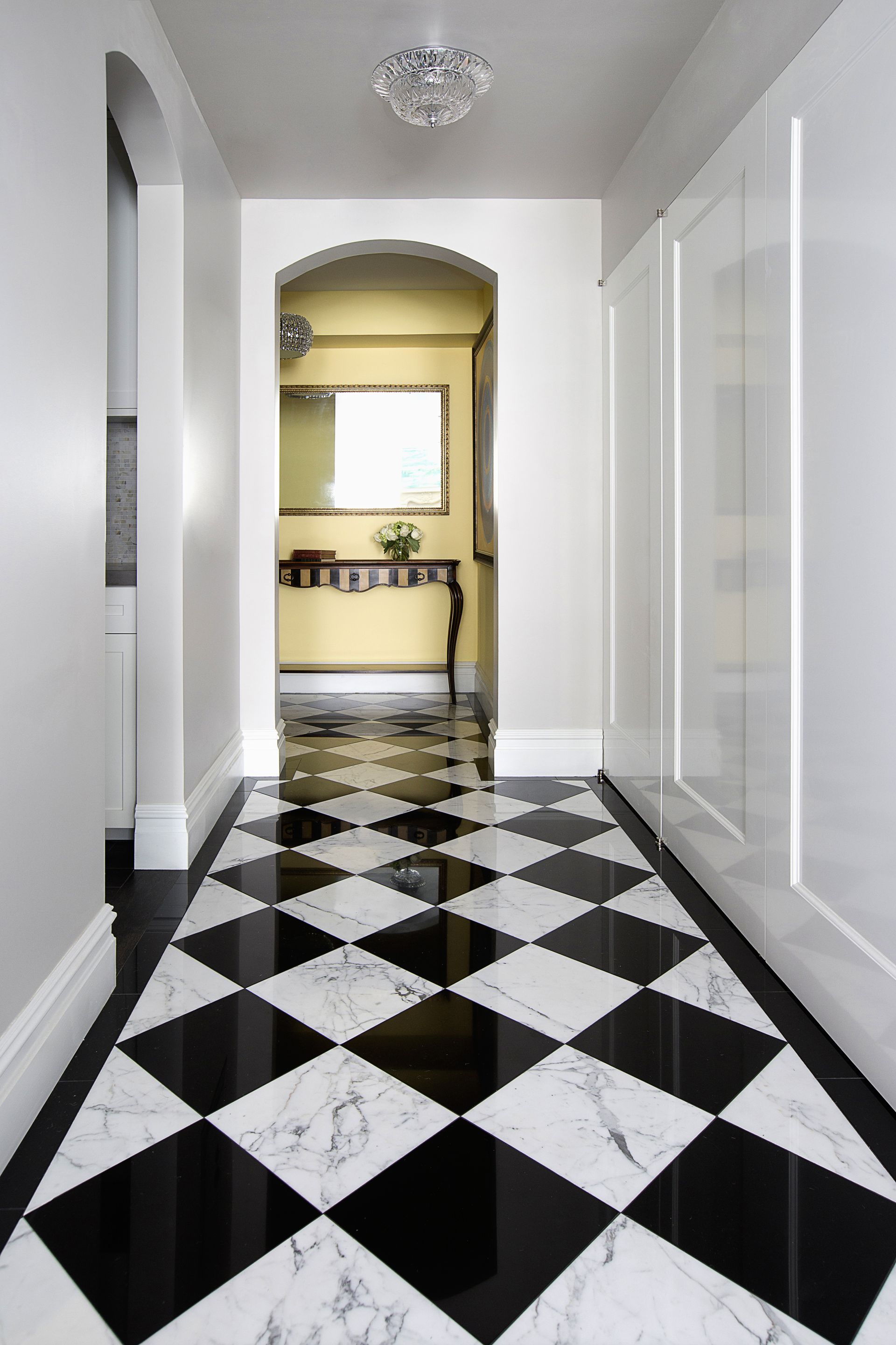 This corridor features a statuary and pure black check marble floor set against three spray-lacquered doors.