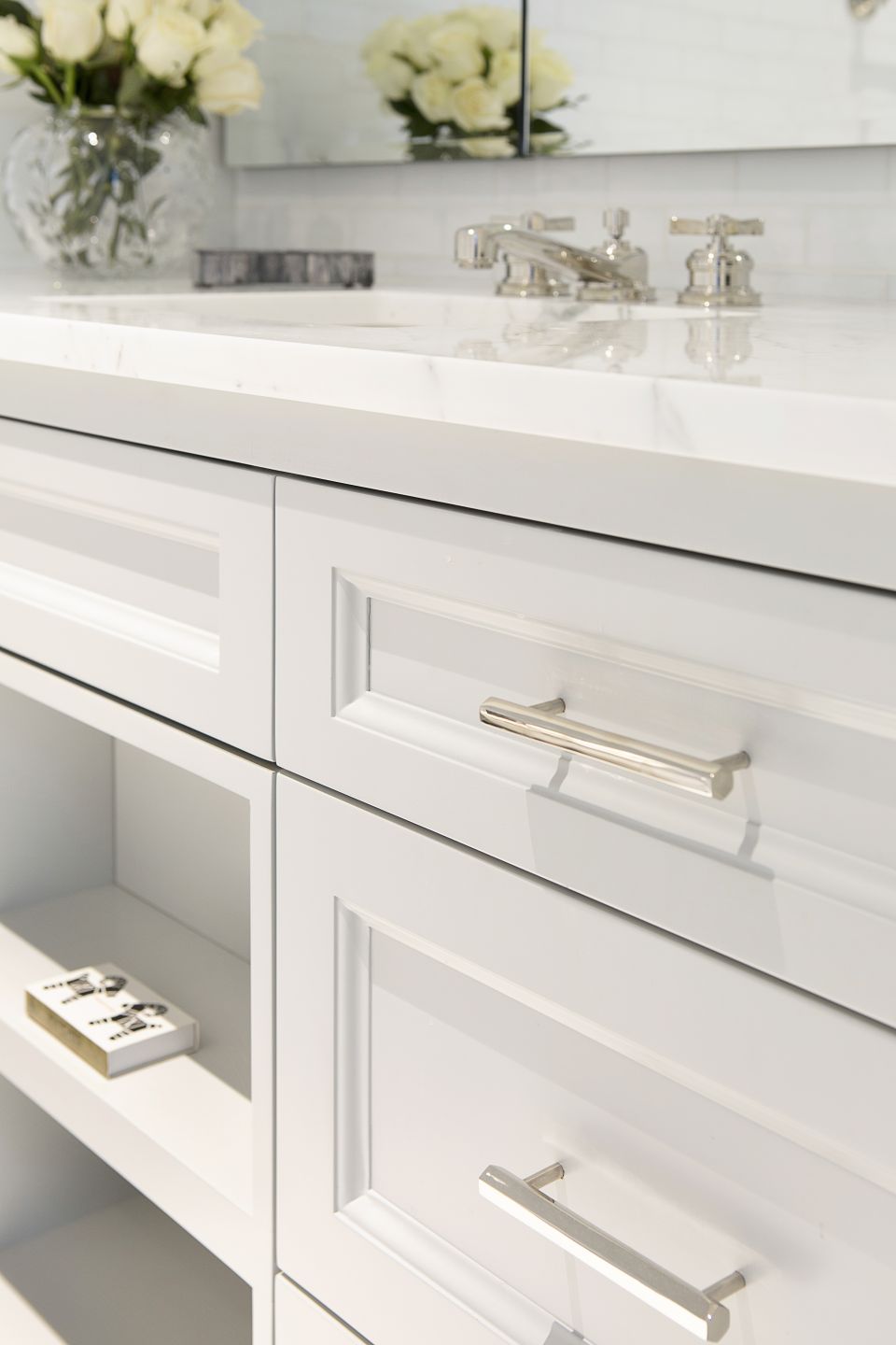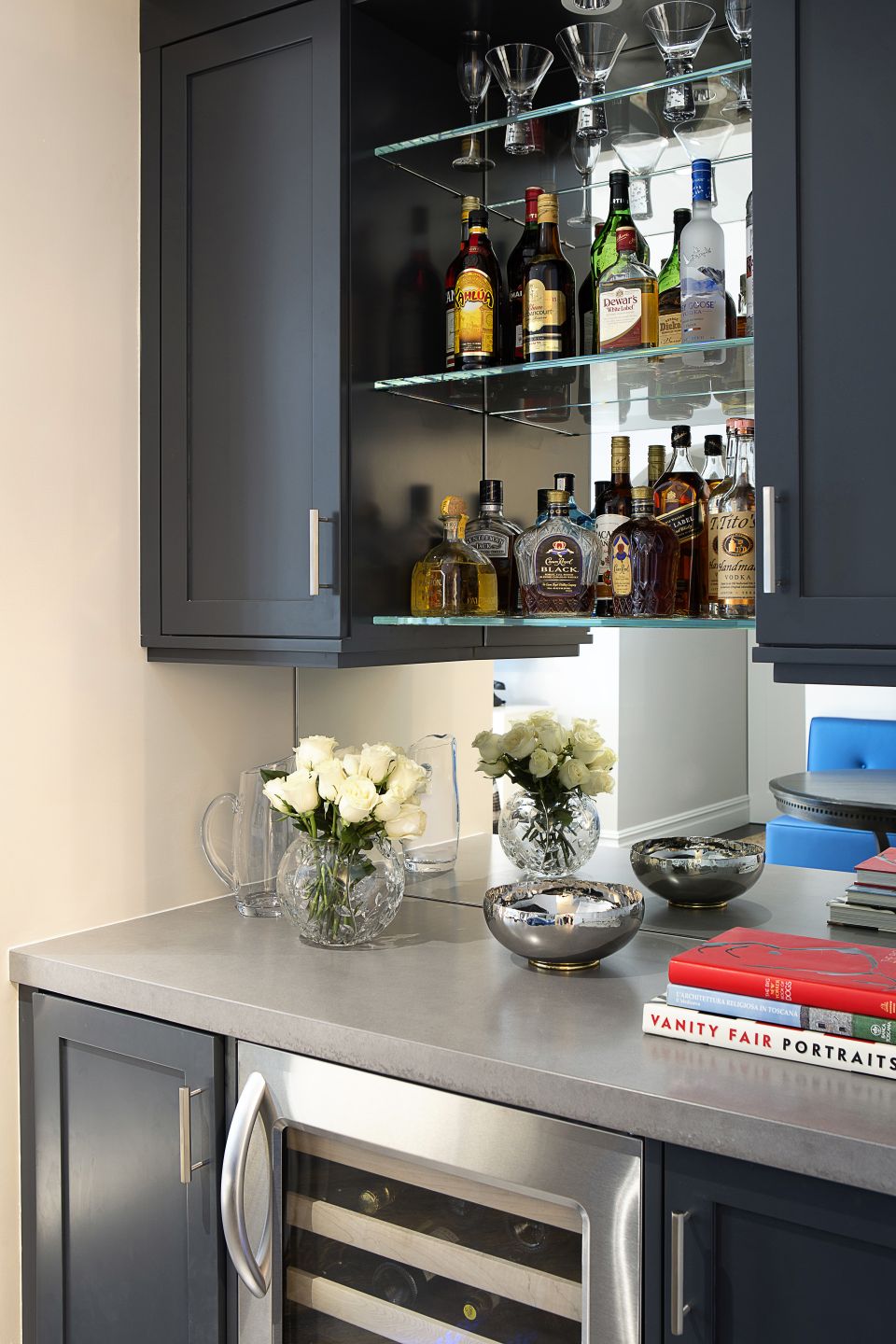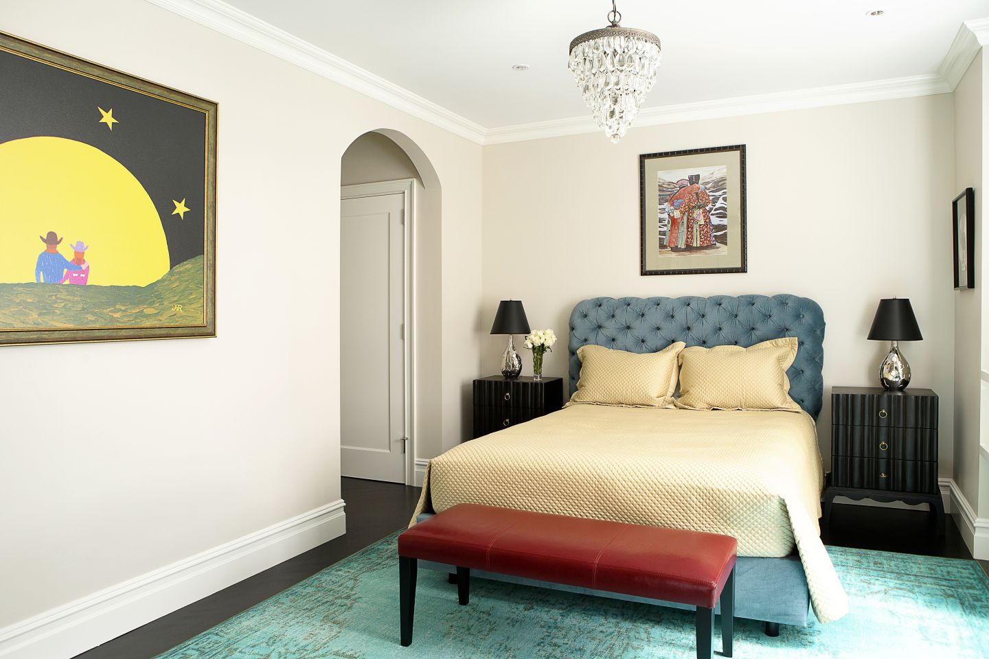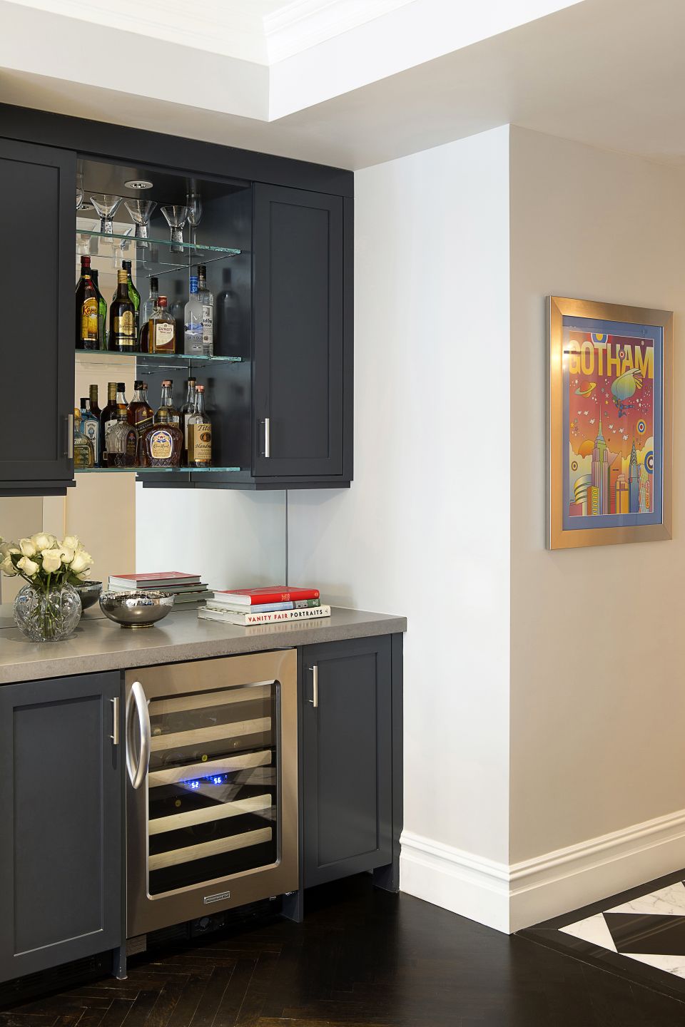 This corridor features a statuary and pure black check marble floor set against three spray-lacquered doors.